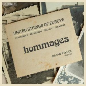Hommages is a splendid addition to the four earlier recordings by the United Strings of Europe (USE) on BIS, with its latest augmenting works by Dobrinka Tabakova (b. 1980), Osvaldo Golijov (b. 1960), and Olli Mustonen (b. 1967) with Igor Stravinsky’s neo-classical ballet Apollon musagète. The collection makes good on the London-based company’s mission to combine the new with the familiar and to experience the latter in a different way. That applies in this case to the Stravinsky work, which appears here in a new arrangement by the ensemble’s artistic director and lead violinist Julian Azkoul. On the sixty-eight-minute release, the USE pays homage to the great Russian but also fellow twentieth-century composers Carlos Gardel and Astor Piazzolla.